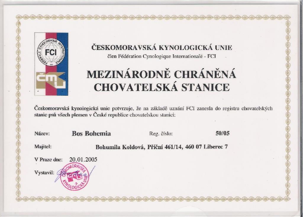 | Adresa: Příční 461/14, 460 07 Liberec 7 Telefon: +420605527740 Zodpovědná osoba: Bohumila Koldová www: bosbohemia.wbs.cz Mail: | Reg. číslo CHS: 50/05 Certifikát CHS: Zobrazit Certifikát ::: Plánujeme vrh: 20.04.2011 Hodnocení: 76 bodů ze 100 |
